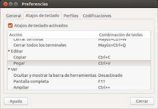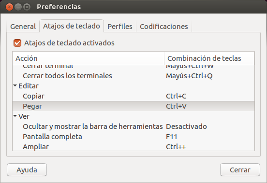 Reprogramar teclas rápidas en la terminal: Atajos de teclado. Posted on 2017-12-20 por paco Es posible reprogramar en linux las teclas rápids en la terminal como Ctrl+C para copiar y Ctrl+V pegar. Tenemos que buscar en el menú de la terminal las preferencias y seleccionar atajos de teclado.